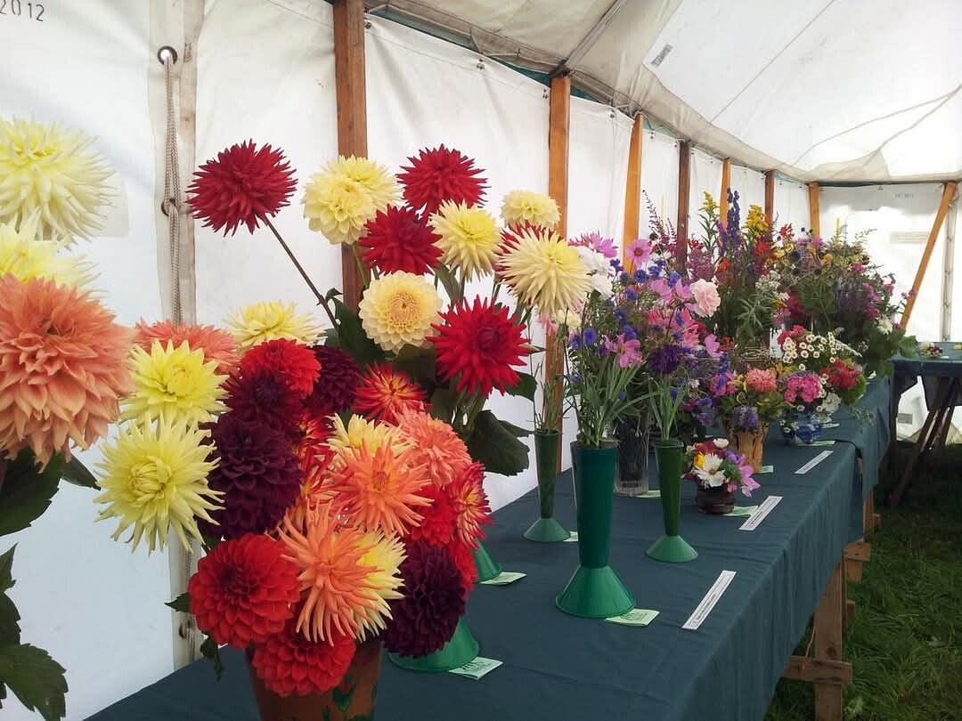 Running alongside these works of art are the traditional show flower and vegetable classes, which are prey to weather conditions perhaps even more so. These are the sweet peas, the gladioli, the dahlias, the pansies, the carnations, the pot plants, and for those not daring to attempt floral art, the vases of garden, cottage and annual flowers. The fragrance created by these exhibits means that visitors are reluctant to move on. It’s a very slow perambulation section of the tent.